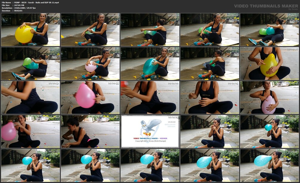 Sarah now uses her strong fingernails to burst 12 balloons. At first she squeezes them with her bare hand and then start popping the final ones using only a finger, slowly. At the end she blows to pop a green 11" with starts printed all around. She enjoys that a lot, you can see on her face!